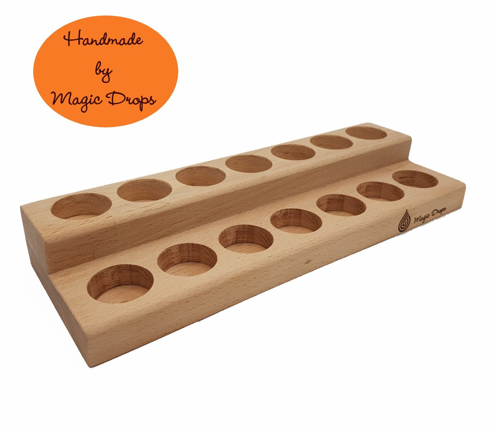 Realizat manual din lemn de fag, suportul Magic 14 aduce ordine, eleganță și siguranță în modul în care îți păstrezi uleiurile esențiale. Cu un design pe două niveluri și spațiu pentru 14 sticluțe de 15 ml, îți expune colecția frumos și practic, protejând în același timp mobilierul de contactul direct cu uleiurile.